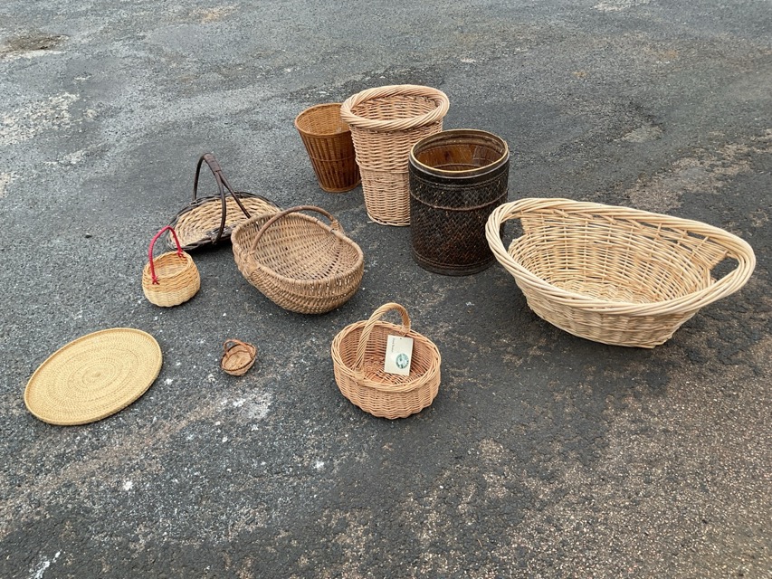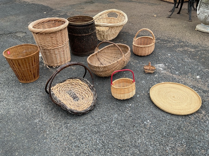 Miscellaneous cane baskets - waste paper, laundry, flower trug, two shopping, miniature, a platter, etc. (10)