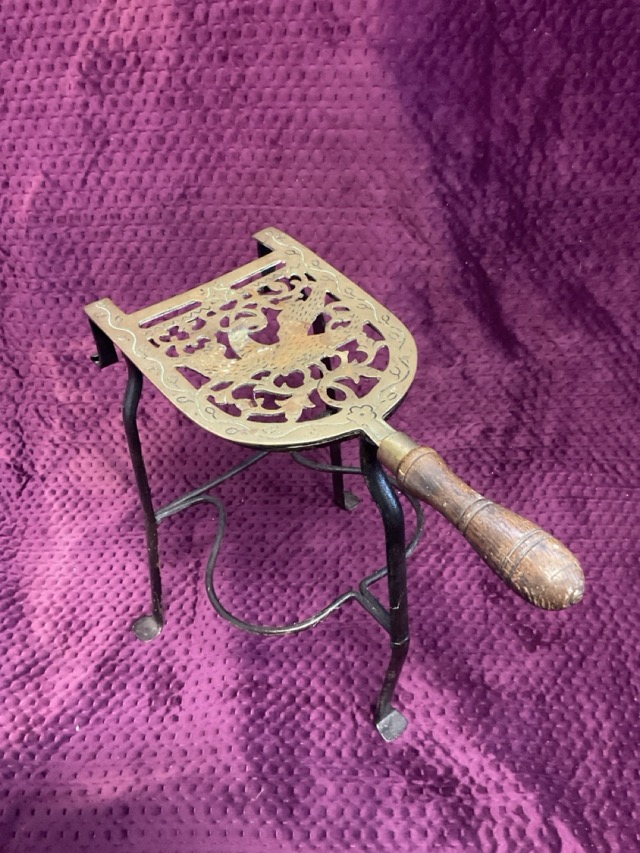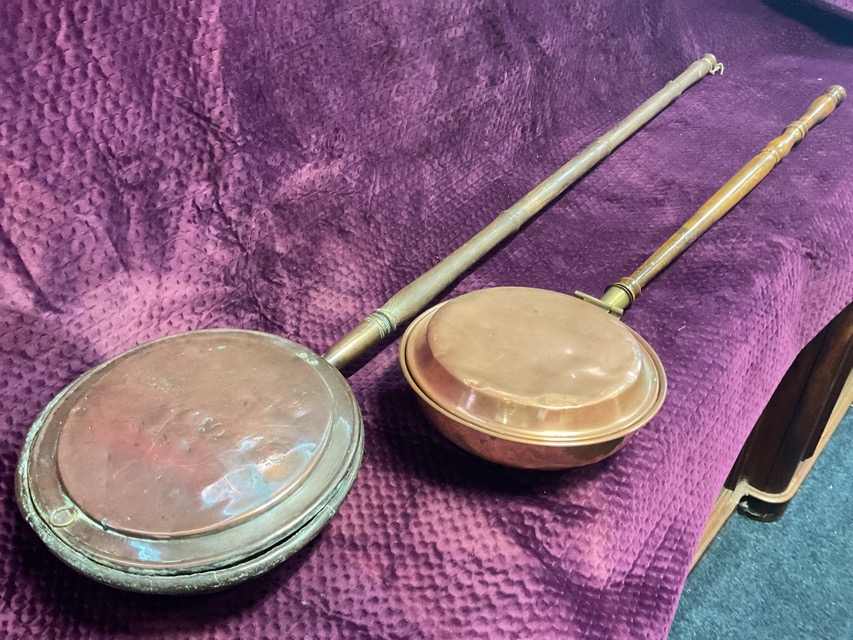 A Georgian copper bed warmer, the covered pan chased with pheasant and flowers on a turned elm handle; a later example with turned handle; and an C18th brass and wrought iron tripod trivet, with pierced eagle and foliate platform and turned oak handle. (3)