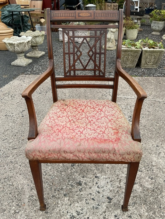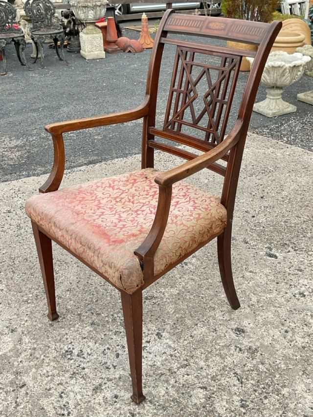 An Edwardian boxwood strung mahogany armchair with flowerhead panel inlaid back and trompe-l’oeil fluting above a pierced Chinese lattice splat, the upholstered seat flanked by arms on curved supports, raised on square tapering legs.