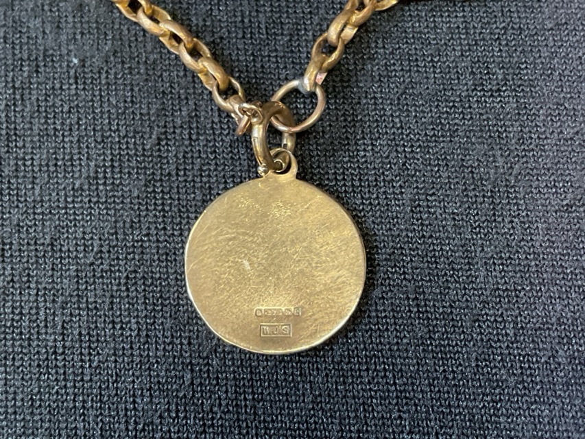 A 9ct gold Saint Christopher pendant on gold plated chain, the medallion depicting figure carrying a child across water. (2.4g)