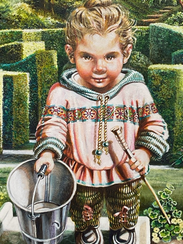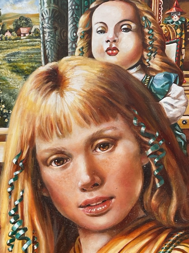 Manuella Norris, oil on board, portrait of a girl in a garden with topiary, unsigned; another of a girl seated in a landscape, signed and dated; and a portrait of a girl and her doll wearing green ribbons, unsigned. (3)