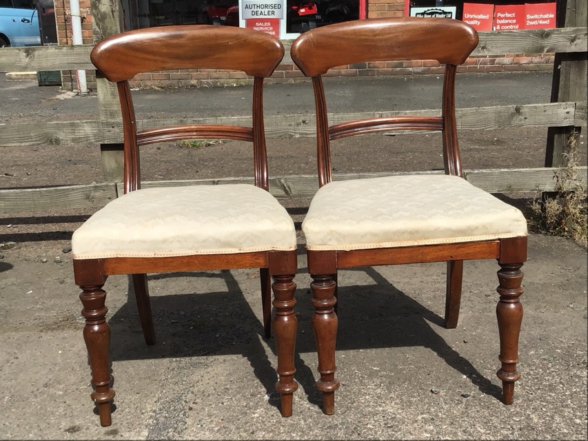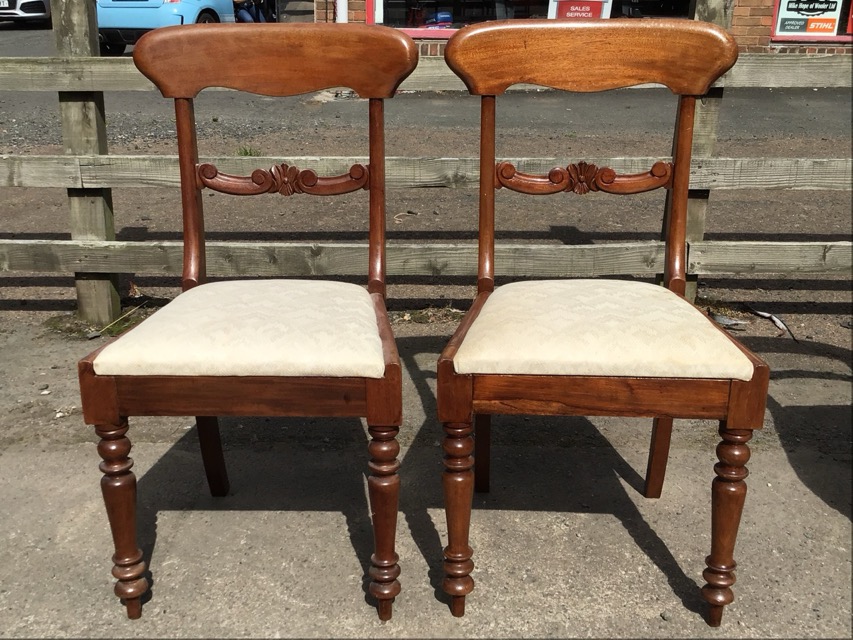 A pair of Victorian mahogany dining chairs, the shaped backs above scrolled carved rails, the drop-in upholstered seats raised on turned tapering legs; and another similar ninteteenth century pair. (4)