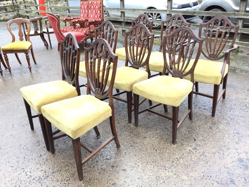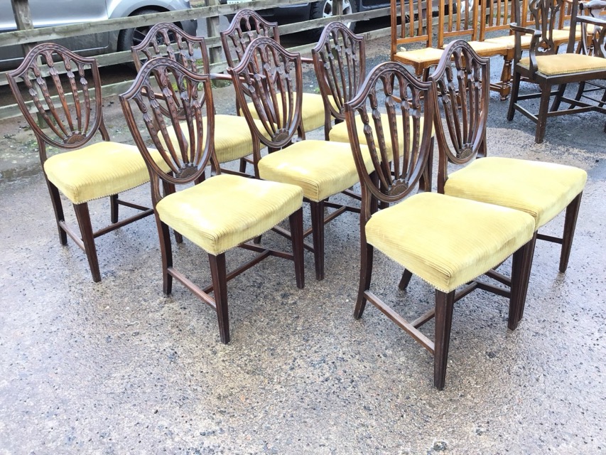 A set of eight Hepplewhite style mahogany dining chairs, the shield shaped backs with harebell carvings above stuffover upholstered seats, raised on square tapering moulded legs joined by rectangular stretchers. (8)