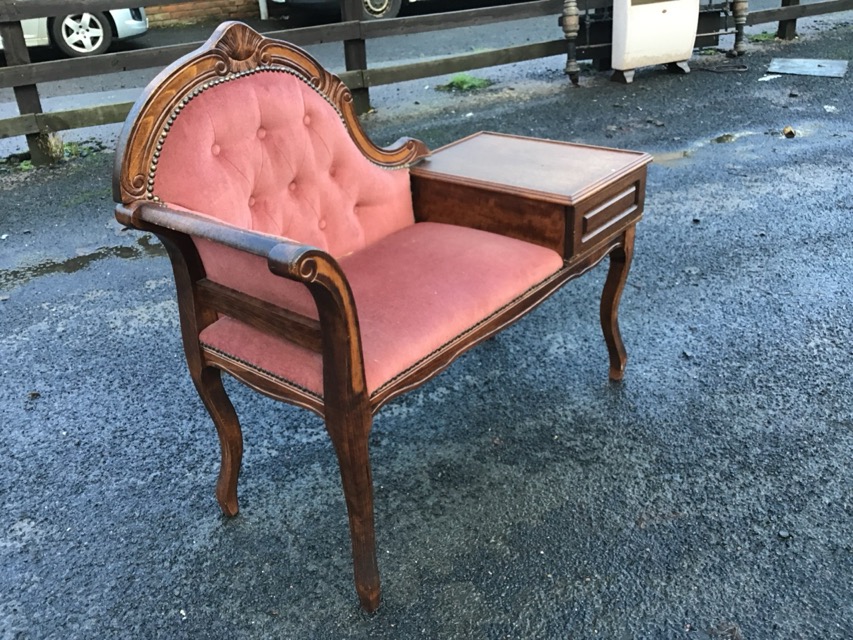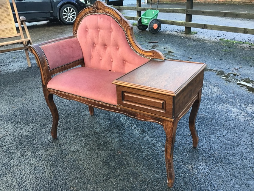 A Victorian style chaise telephone table, the scrolled button upholstered back above a rectangular seat flanked by a telephone shelf with drawer, raised on cabriole legs. (37.5in x 17.5in x 34in)