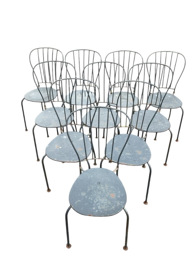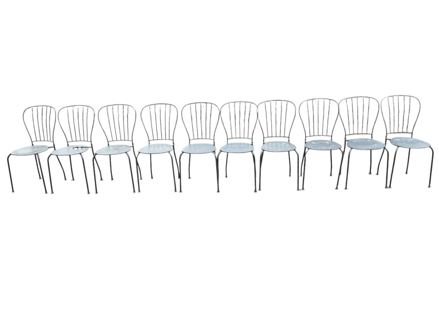 A set of ten wrought iron garden chairs with balloon spindle backs above egg shaped seats, raised on curved rod legs with pad feet. (10)