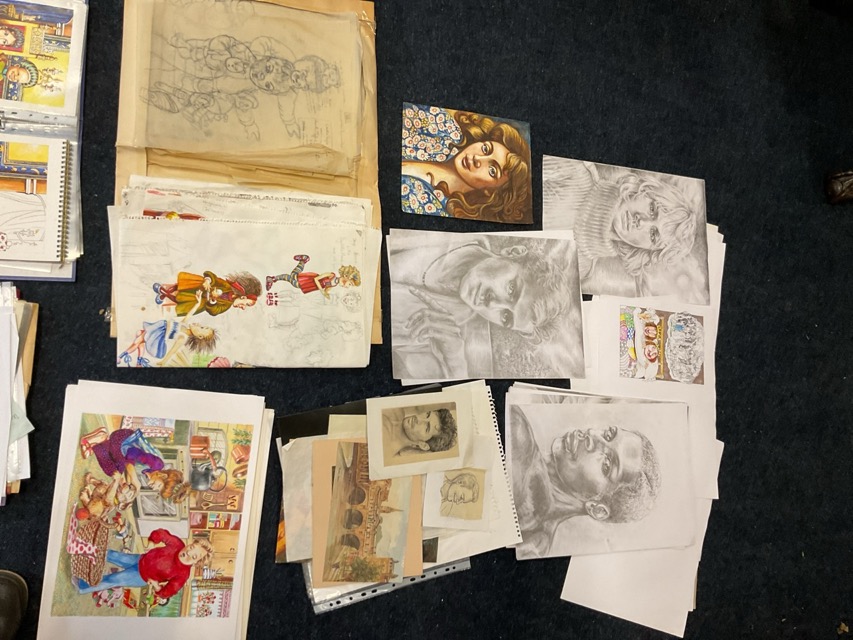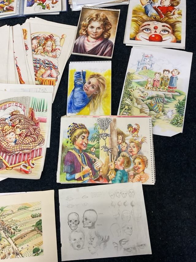 Manuella Walker, a large quantity of original works on paper - two sets of watercolour and ink illustrations for childrens stories, oil on paper & pencil portraits, tracings, historical subjects, illustrations for archaeological reports, etc. (A lot)