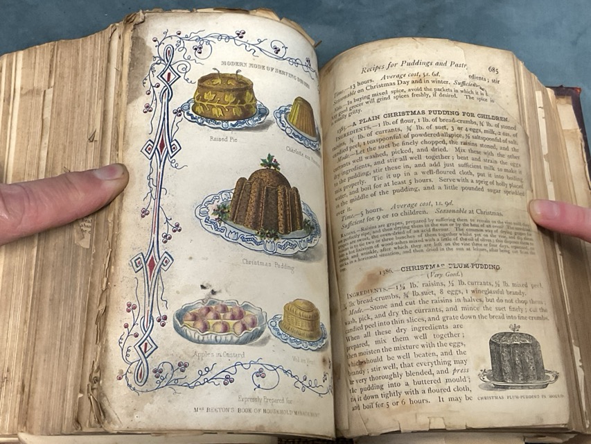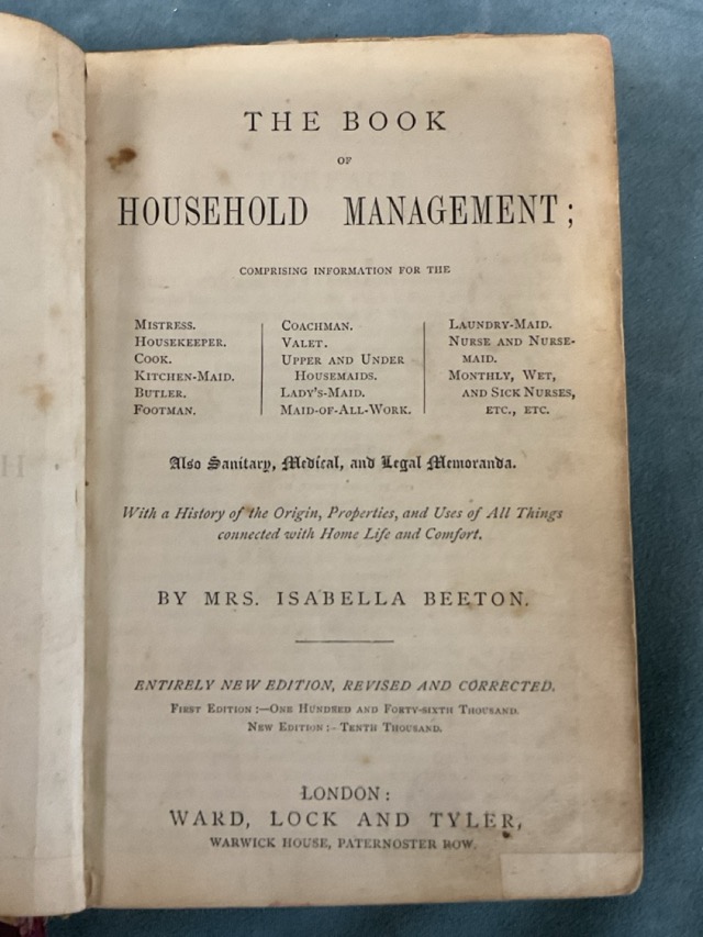 An 1867 leather bound edition of Mrs Beetons Book of Household Management, published by Ward, Lock & Tyler, containing numerous engraved vignettes, illustrations, several colour lithograph plates, and some loose cuttings & handwritten recipes, etc.