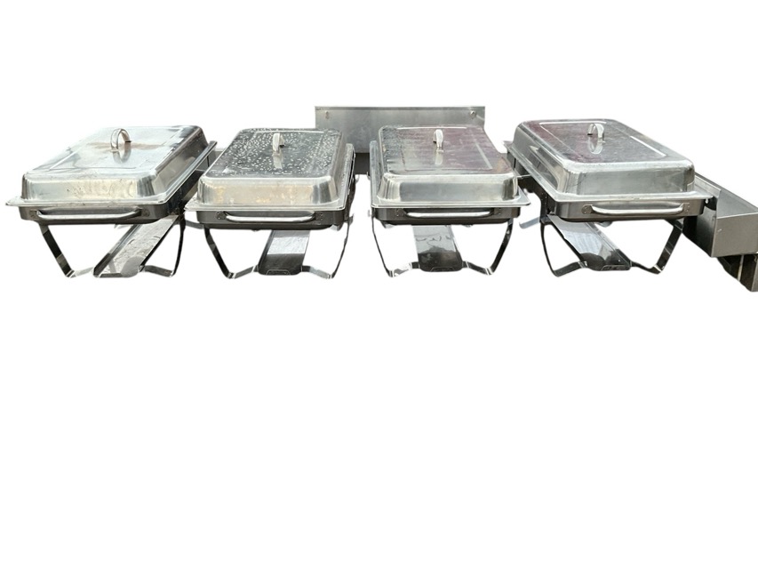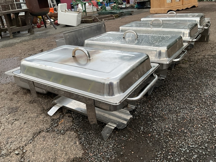 Four rectangular stainless steel food turrines & covers on stands with panelled lids; a pair of stainless steel wall-mountable stepped tray/boxes; and two deeper food trays/basins. (8)