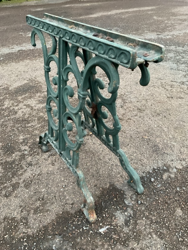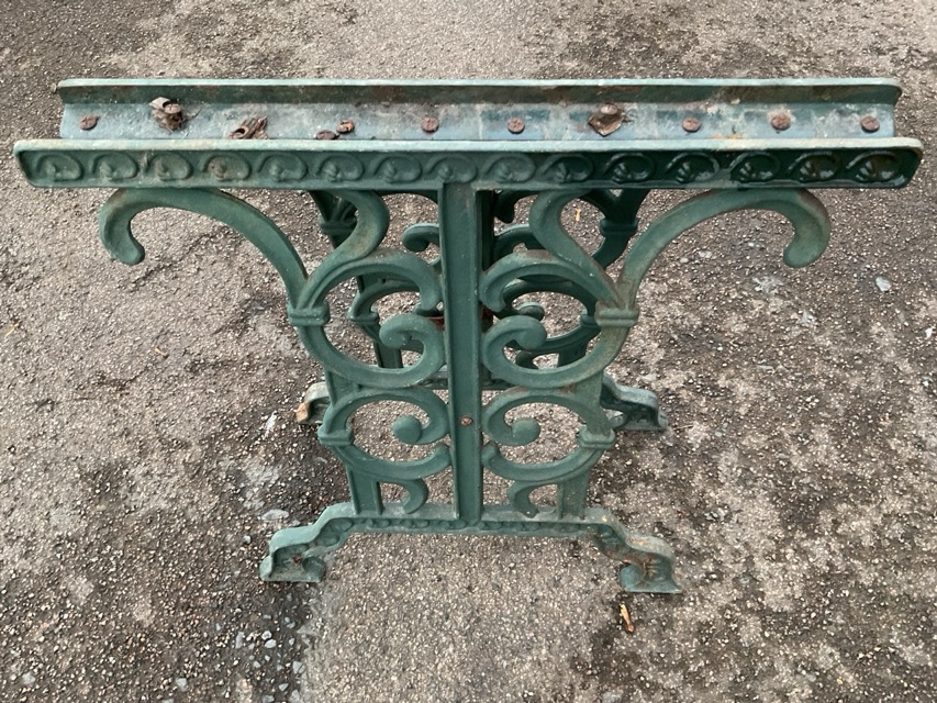 A pair of cast iron garden table supports with pierced scroll cast panels on stepped bracket feet. (25.5in) (2)