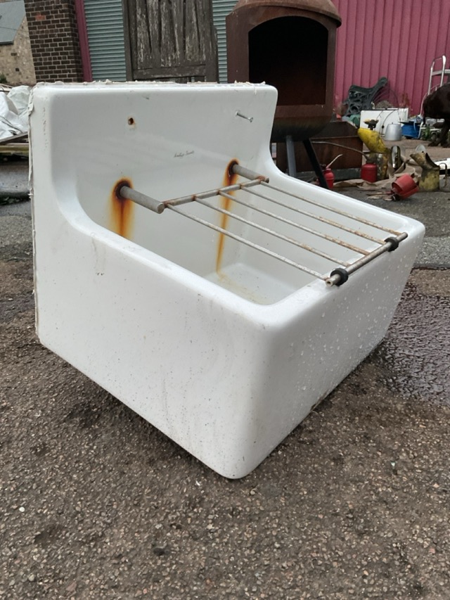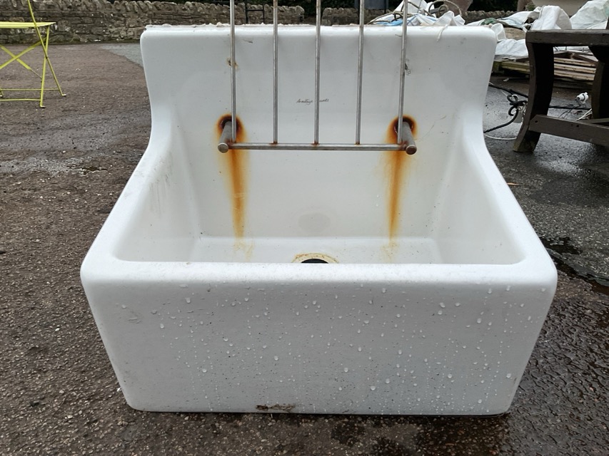 A rectangular Armitage Shanks butlers sink with hinged chromed draining tray to back above a basin. (20in x 15in x 15in)