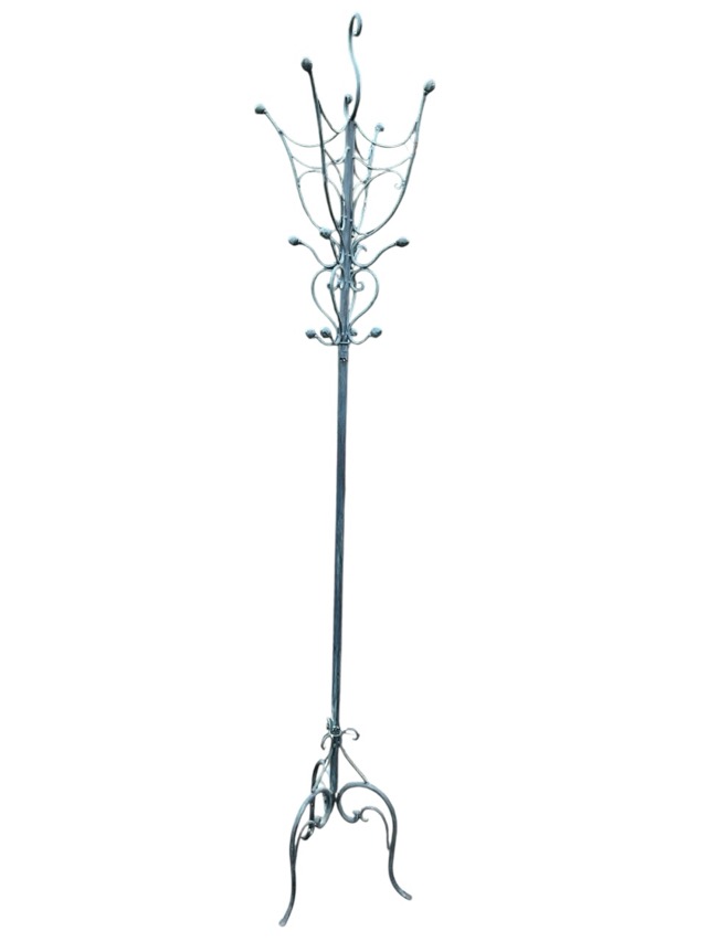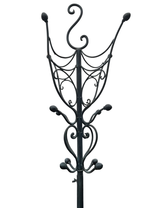 A verdigris patinated metal coatstand with bud shaped pegs on scrolled mounts around a pole with scrolled finial, having tripod legs. (82in)