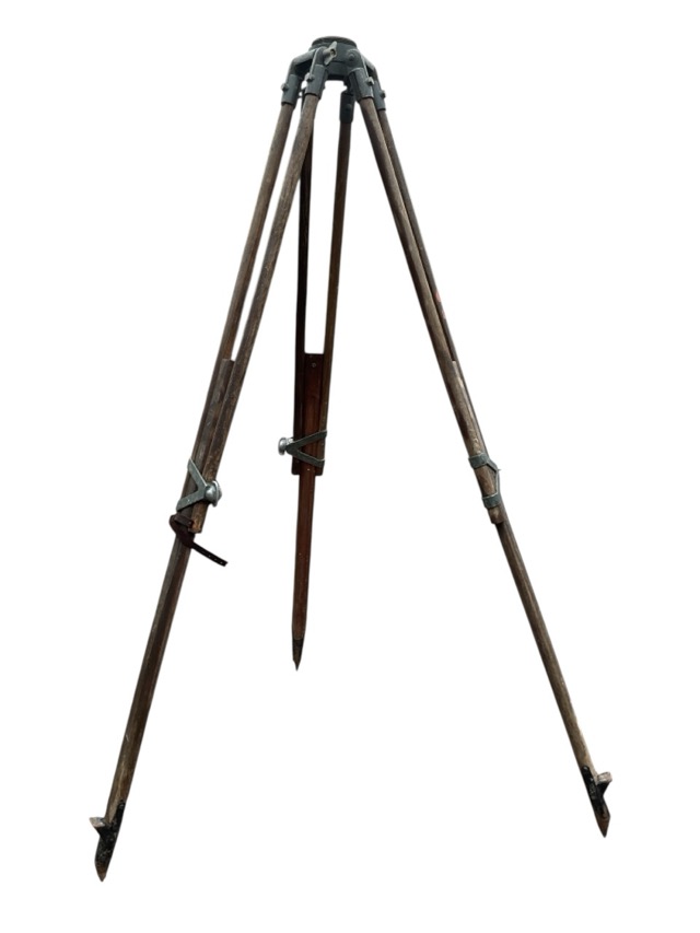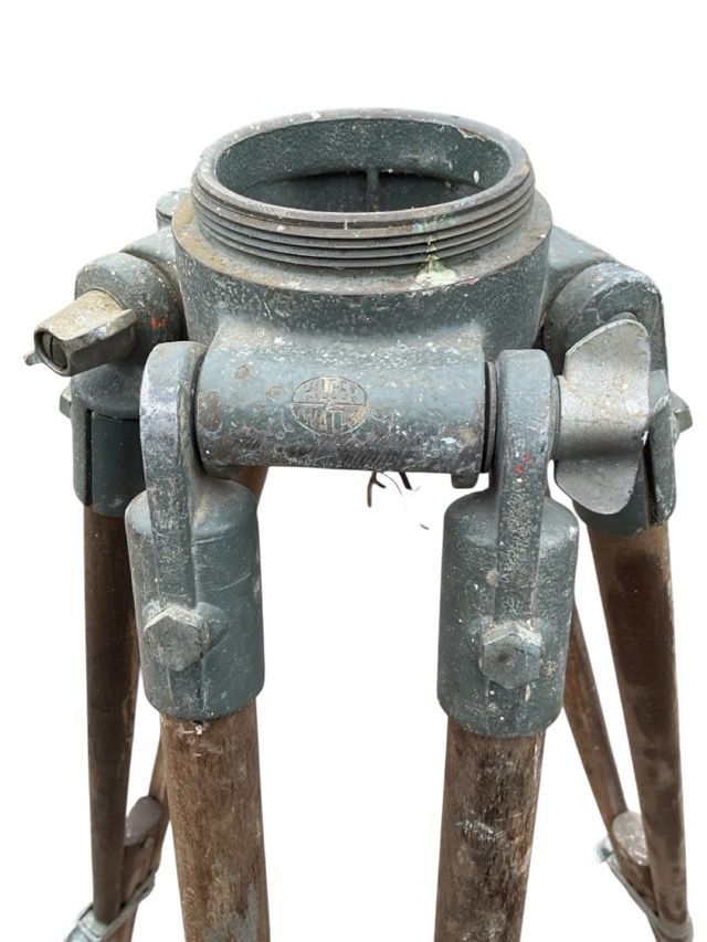 An old telescopic hardwood surveyors tripod by Hilger Watts having metal mounts, the pole supports with ground spikes. (60in)