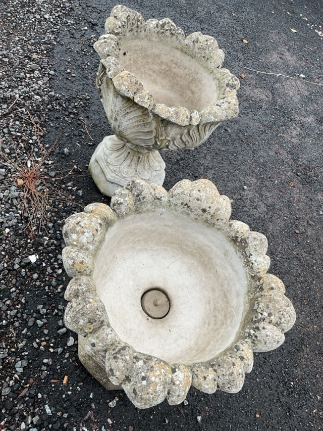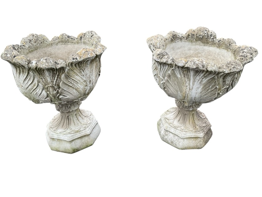 A pair of composition stone leaf cast garden urns on bulbous octagonal bases. (20in x 23.5in) (2)
