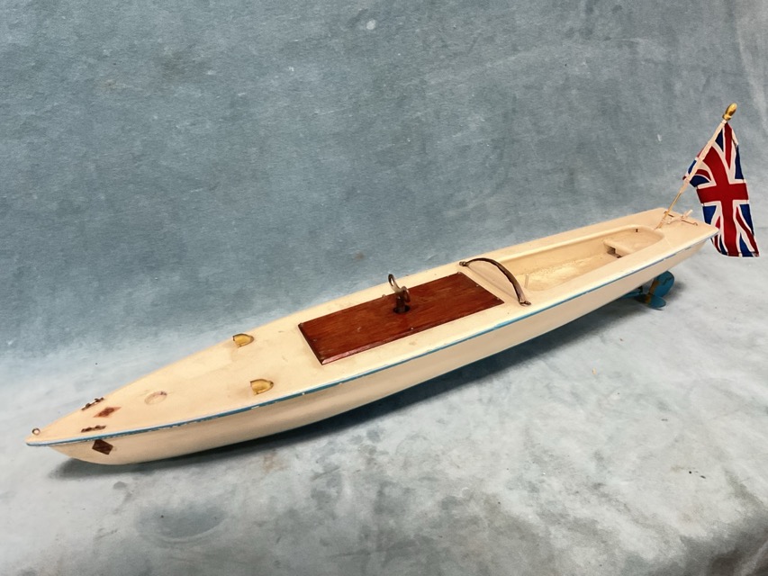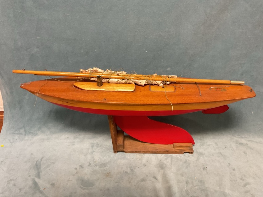 A 50s mahogany 30in model racing yacht by Bowman with mast, boom, spars and sails, operating rudder and stand; and a 26.5in aluminium hulled clockwork motor launch by B Boats. (2)