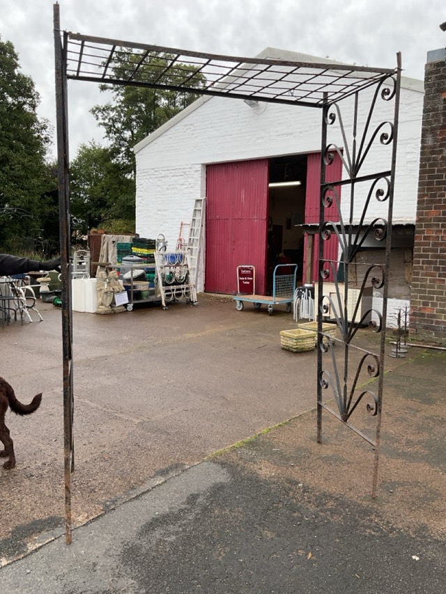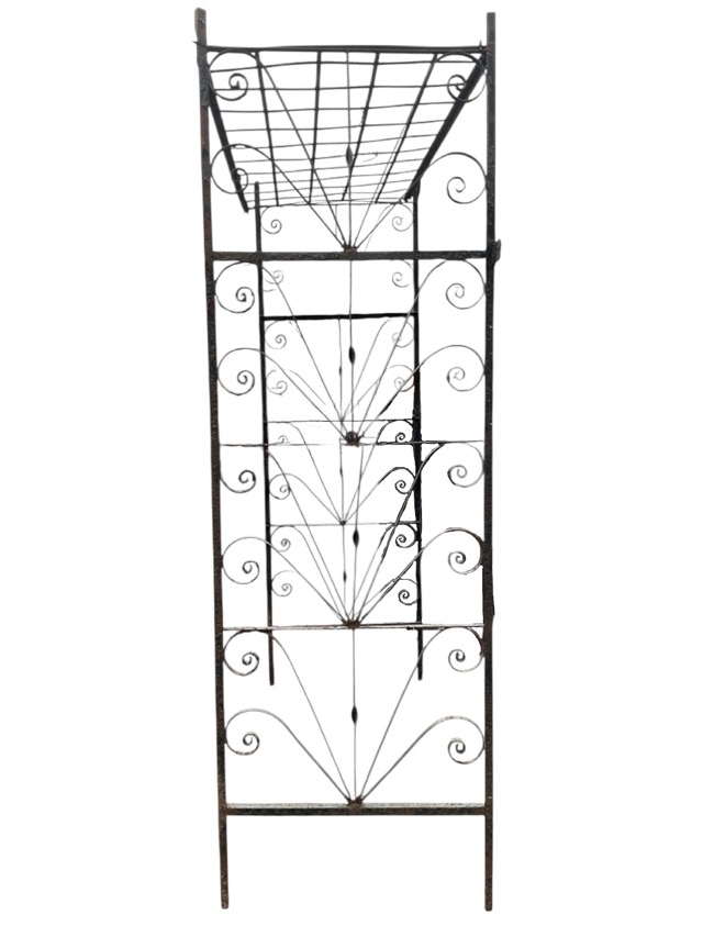 A 7ft wrought iron garden entranceway with two rectangular scrolled panels supporting square trelliswork roof. (66.6in x 30in x 92in)