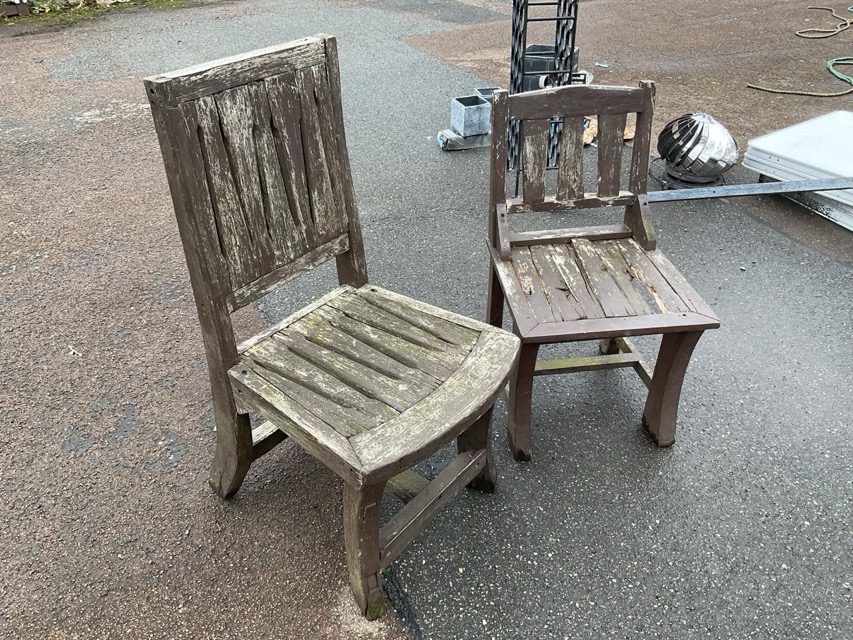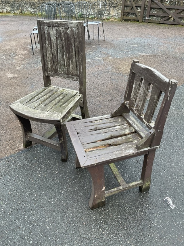 Two old garden chairs - hardwood and on sabre shaped legs - one fucked. (2)