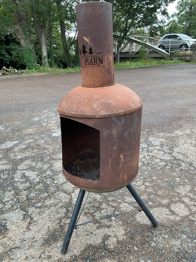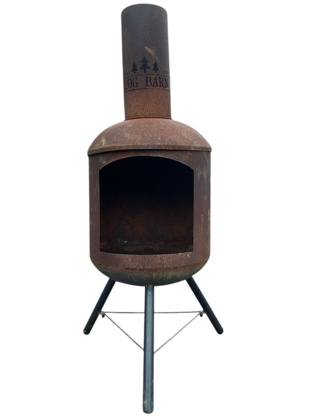 A Log Barn garden chimera with domed barrel shaped fire chamber below a short chimney, raised on tripod base with angled legs. (47.5in)