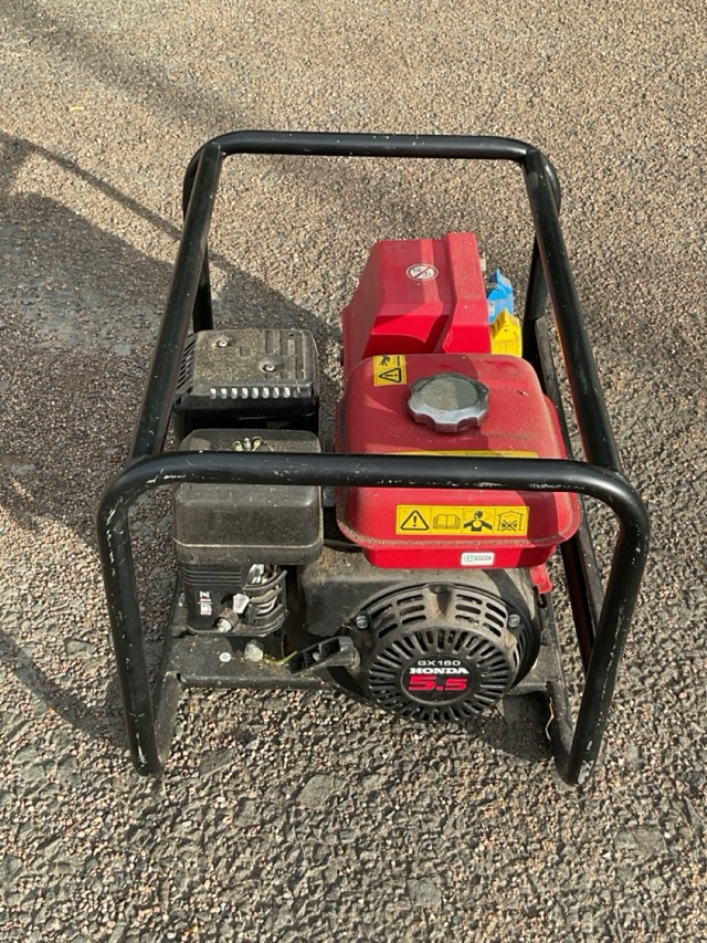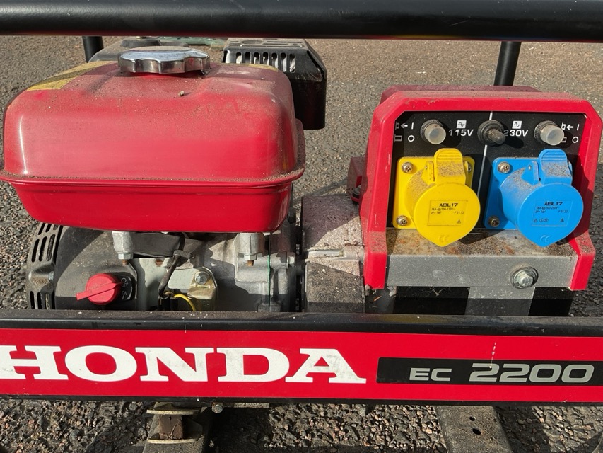 A Honda Gx160 generator, model EC2200, with 115/ 230v double output, in tubular metal frame. (17in x 23in x 17.5in)