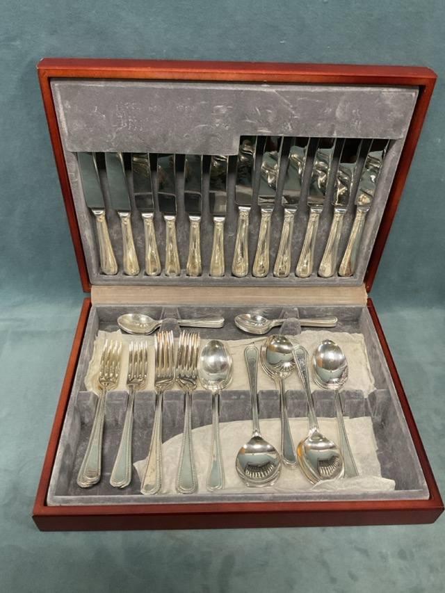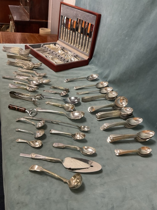 A Sheffield Cutlery bead pattern mahogany cased silver plated six-place canteen; and several loose sets of Old English and other patterns of Ep cutlery, etc. (A lot)