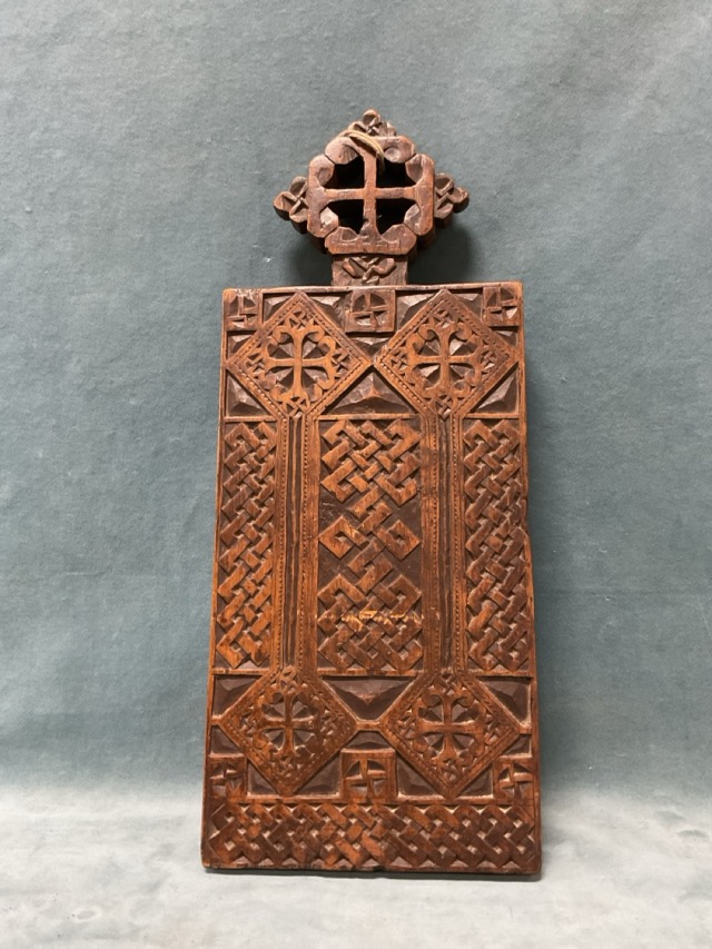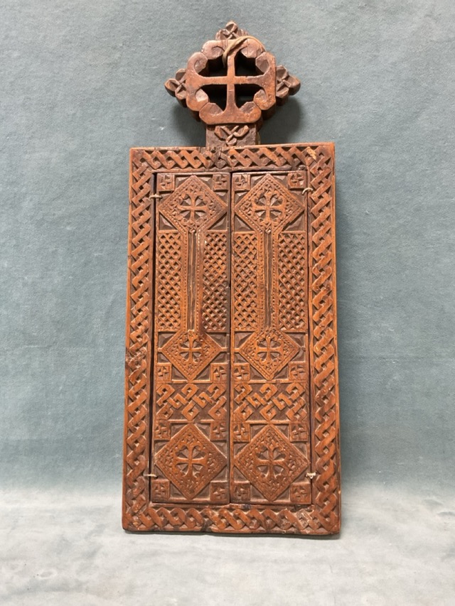 An Ethiopian Orthodox icon with cross finial above a geometric interlace carved case with two doors opening to paintings of the Madonna and child flanked by angels and four saints, etc.