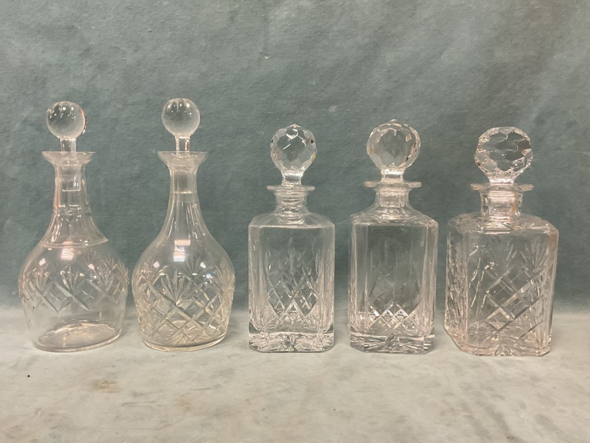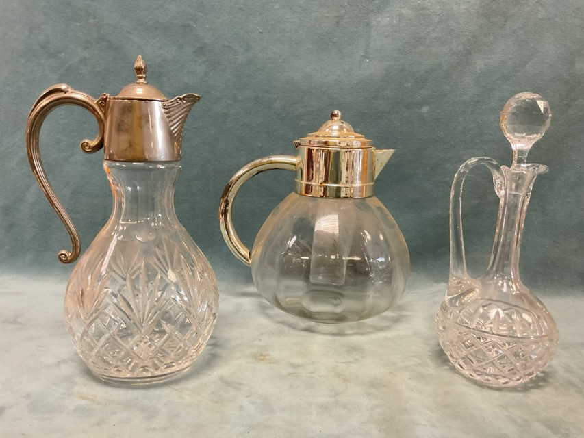 Seven cut glass decanters - a claret jug with silver plated mounts, a stoppered jug, Edinburgh Crystal mallet-shaped, square spirit style; and a pear-shaped glass lemonade jug with silver plated mounts and removable ice chamber. (8)