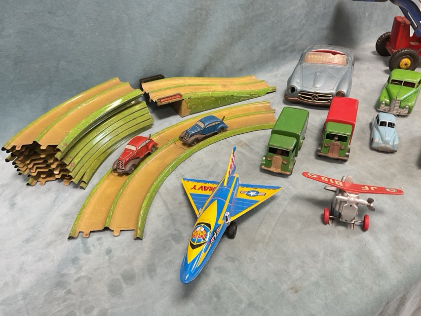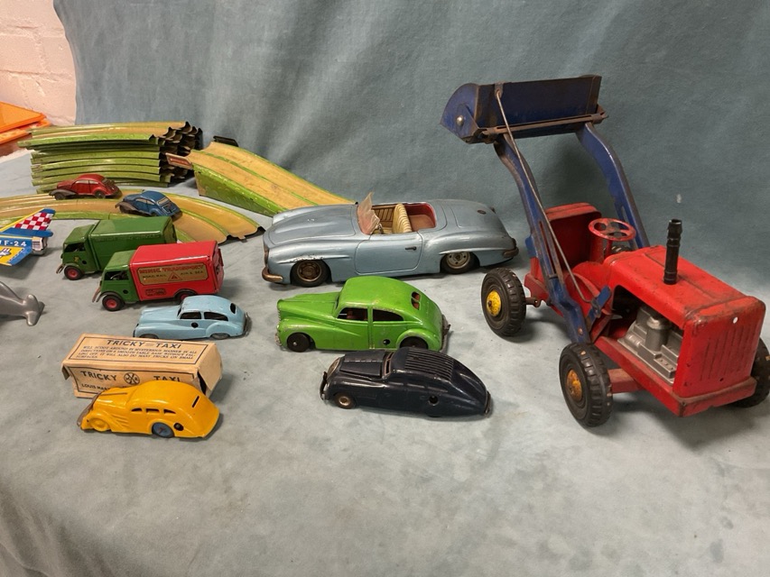 Miscellaneous 30s-60s tinplate toy vehicles - a racetrack with cars, clockwork cars by Pocketoy, Schuco, Metoy, a boxed Louis Marx Tricky Taxi, a tractor, a Mercedes sports car, Tri-ang Minic vans, a Japanese jet, a backflipping monoplane, etc. (11)