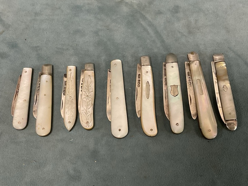A collection of mother-of-pearl hallmarked silver fruit knives - undated Georgian, Sheffield 1870, 1897, 1899, 1916, 1923, 1924, 1925, & 1928, a double-bladed penknife with hallmarked guards by Deakin & Francis - Birmingham 1969. (10)