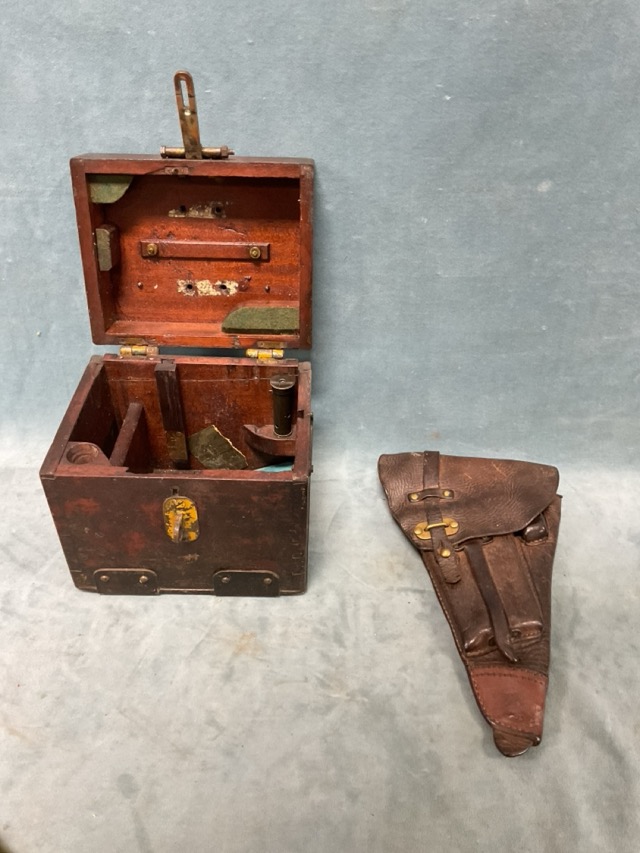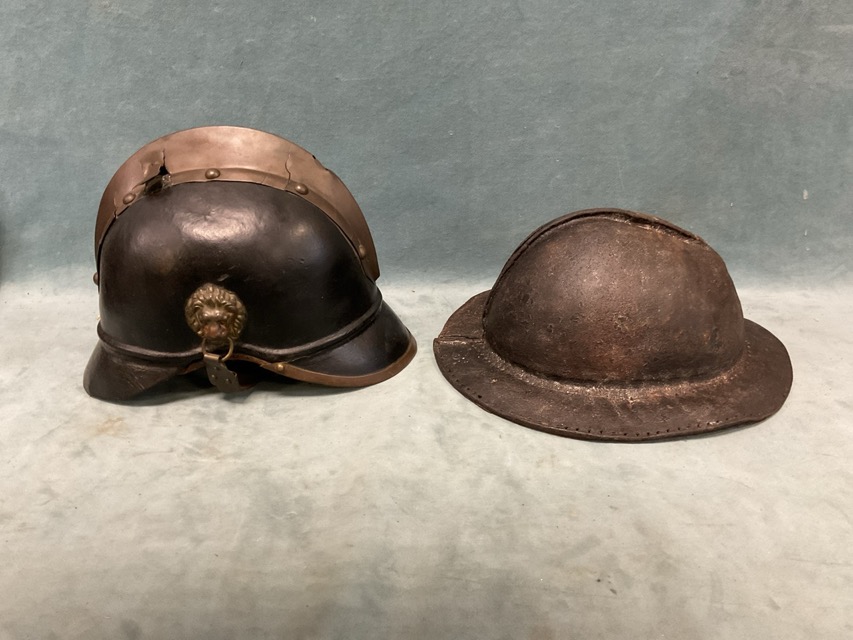A C19th iron mounted mahogany instrument case with brass hasp and handle; a German C19th brass mounted leather firemans helmet; a Victorian hardened leather miners helmet; and a Swedish WWII leather pistol holster. (4)
