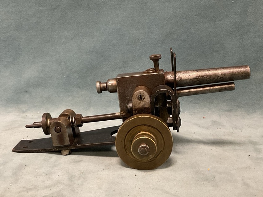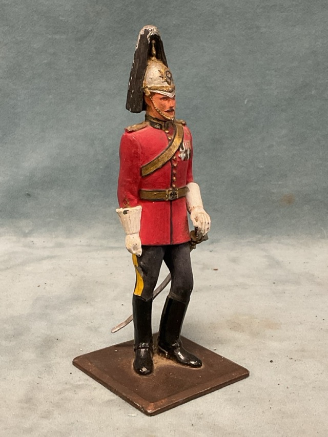 A scratch-built steel and brass model field gun with spring action and screw thread elevation mechanisms; and a handpainted lead figure of a Household Cavalry officer in dress uniform. (2)
