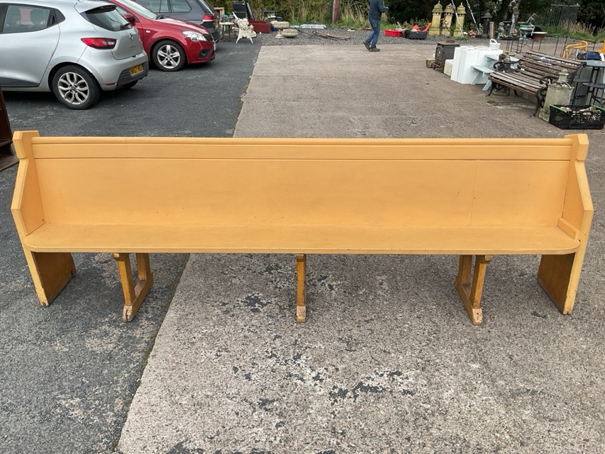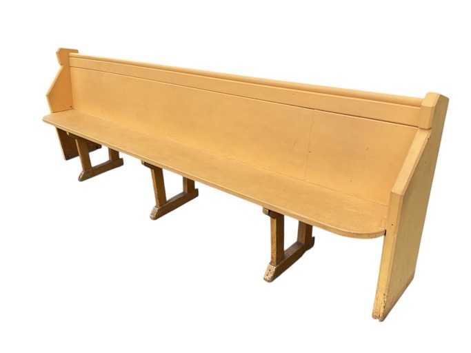 A long painted Victorian pine pew, the back with tubular rail and hymn book shelf, the plank seat framed by plain chamfered angled arms. (113.5in)