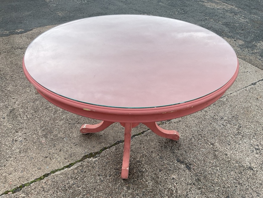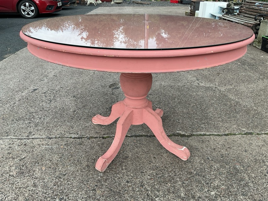 A circular painted breakfast table with plate glass top and plain apron supported on bulbous turned column with quadripartite shaped legs. (46.5in x 30.5in)