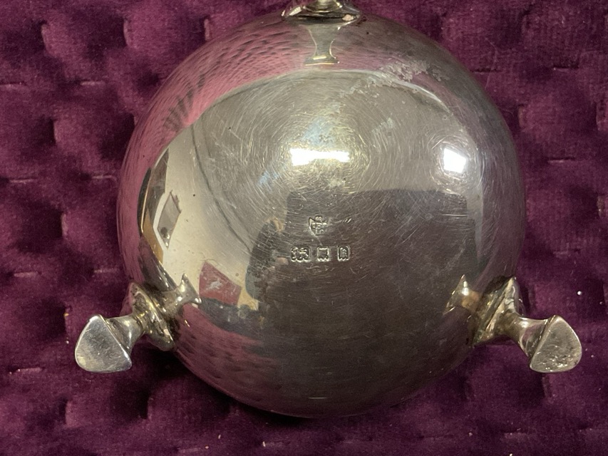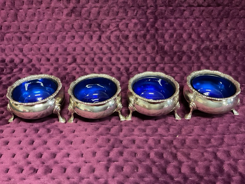 A cased set of four hallmarked silver salts of cauldron form with gadrooned rims, each raised on shaped legs with hoof feet with blue glass liners - Harrods cased, London, 1904/5, Edward Barnard & Sons. (2.75in) (208.3g) (4)