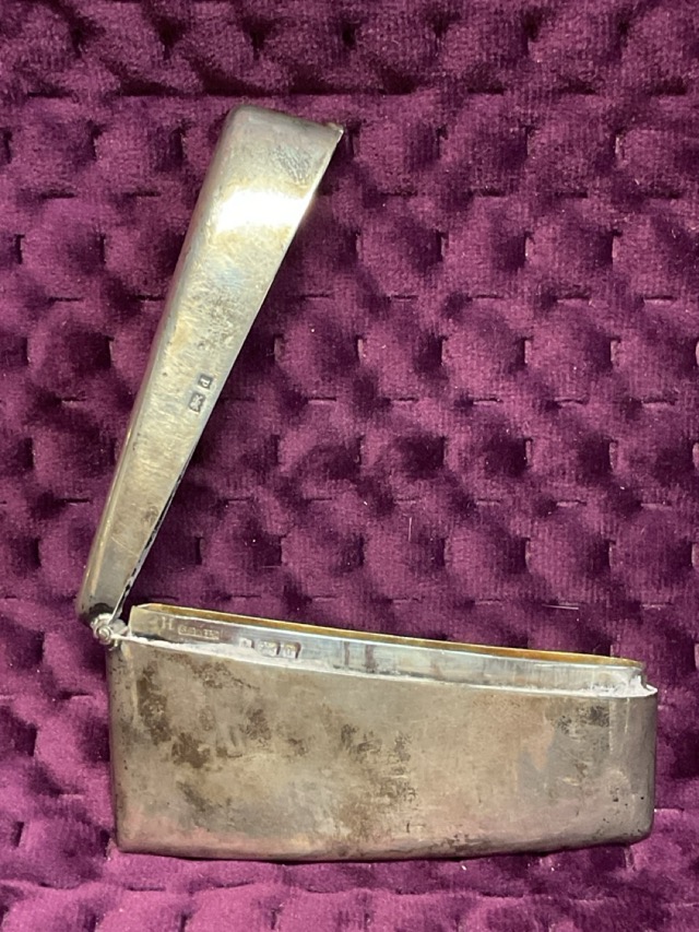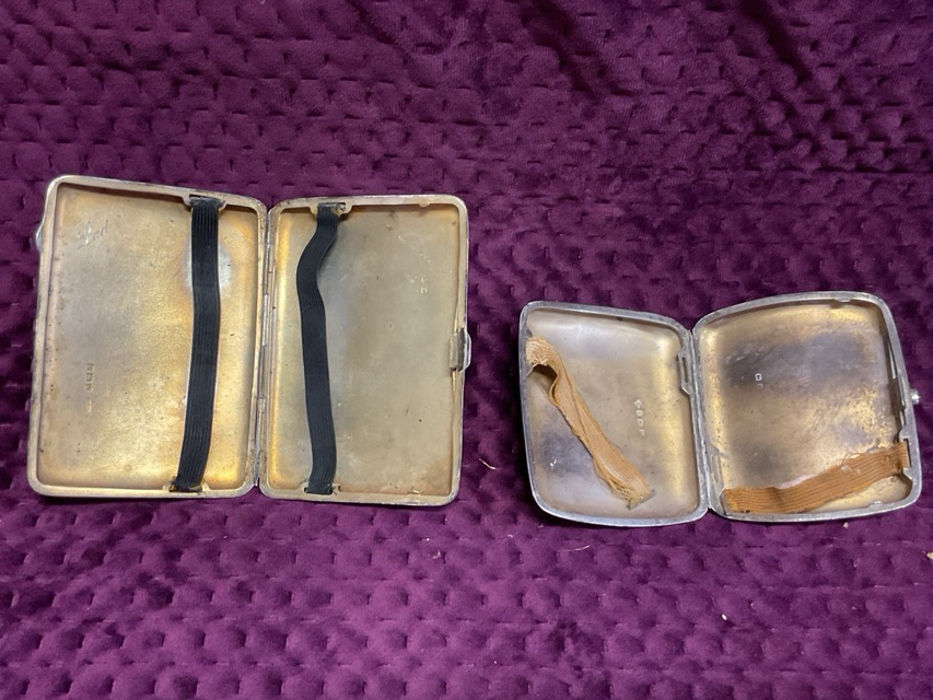 Two Birmingham hallmaked cigarette cases and a Birmingham hallmarked shaped card case, all with hinged lids - 1903, 1916 & 1918. (279.4g) (3)