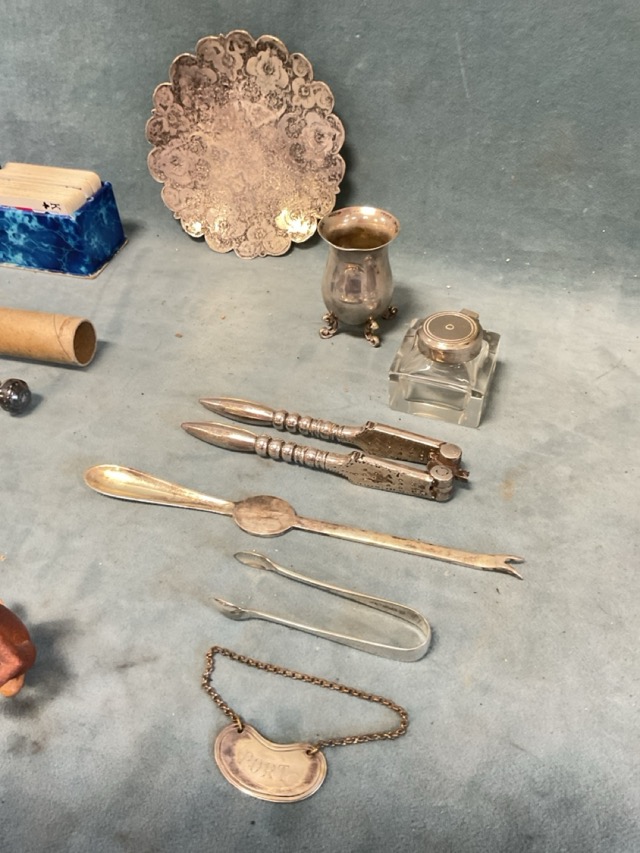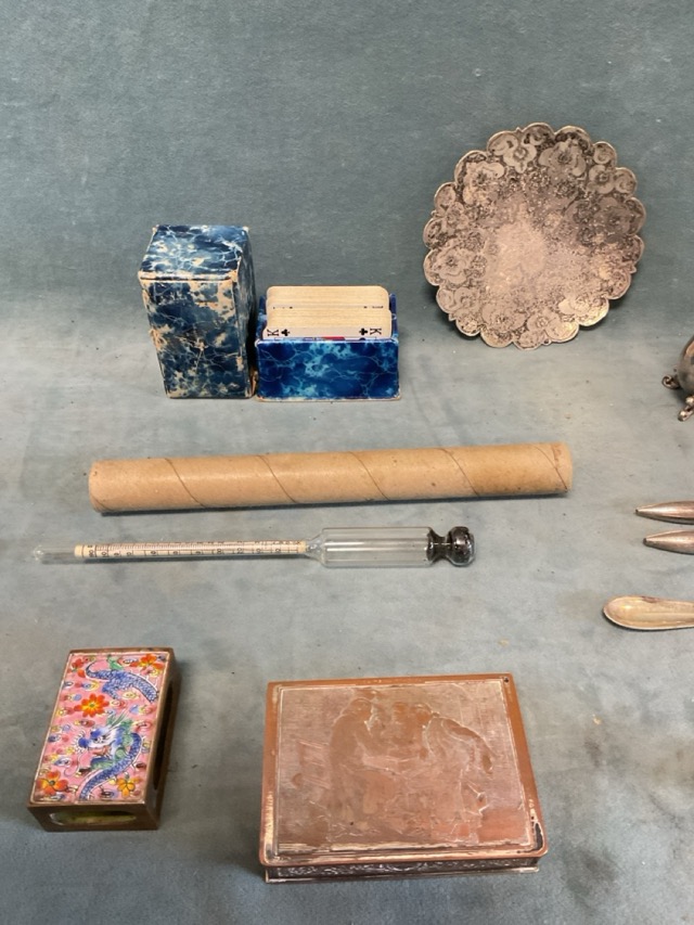 Miscellaneous items - a Chinese enamelled matchbox case, a French snuff box, an EPNS lobster pick, a circular eastern dish, an inkwell, a vase on scrolled feet, a box of patience cards, a carved shell, etc. (A lot)
