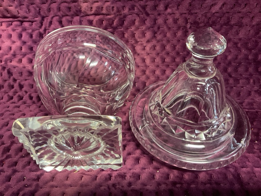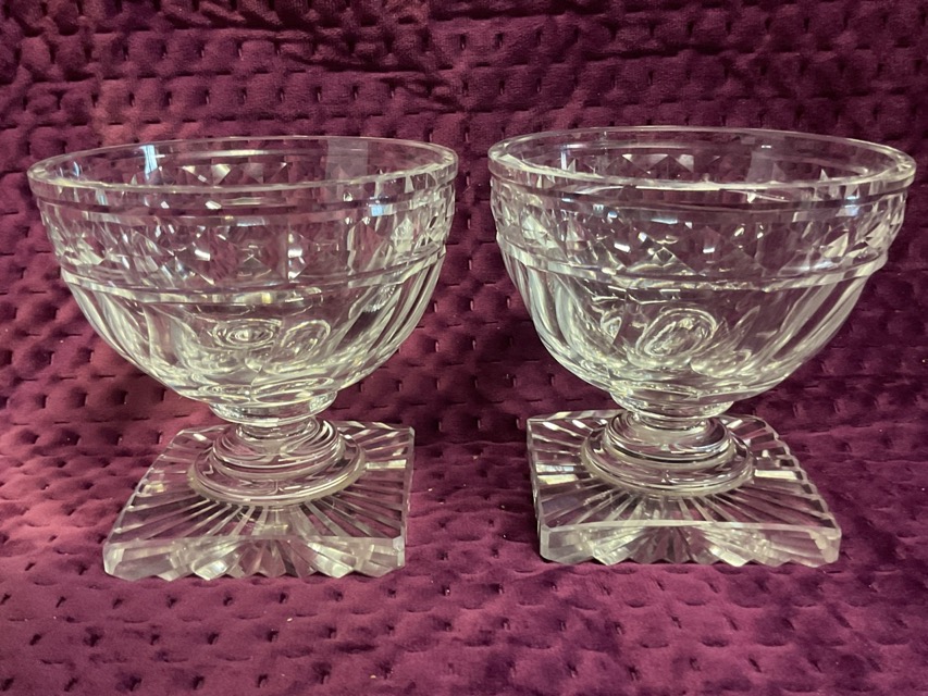 A pair of C19th Irish lidded glass urns with shaped sides & star cut borders, having waisted columns raised on square plinths. (8in) (2)