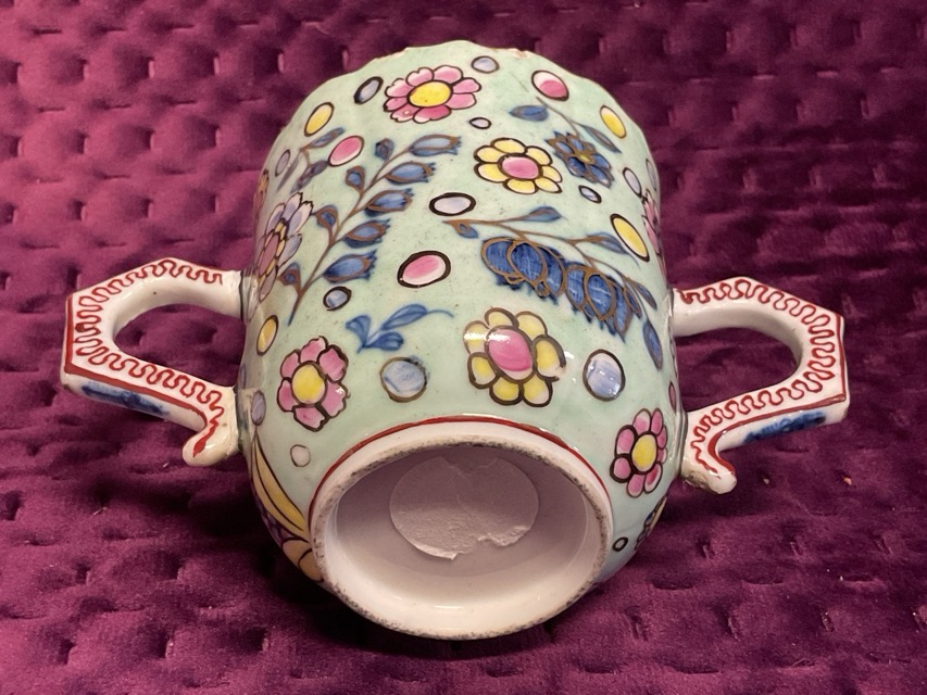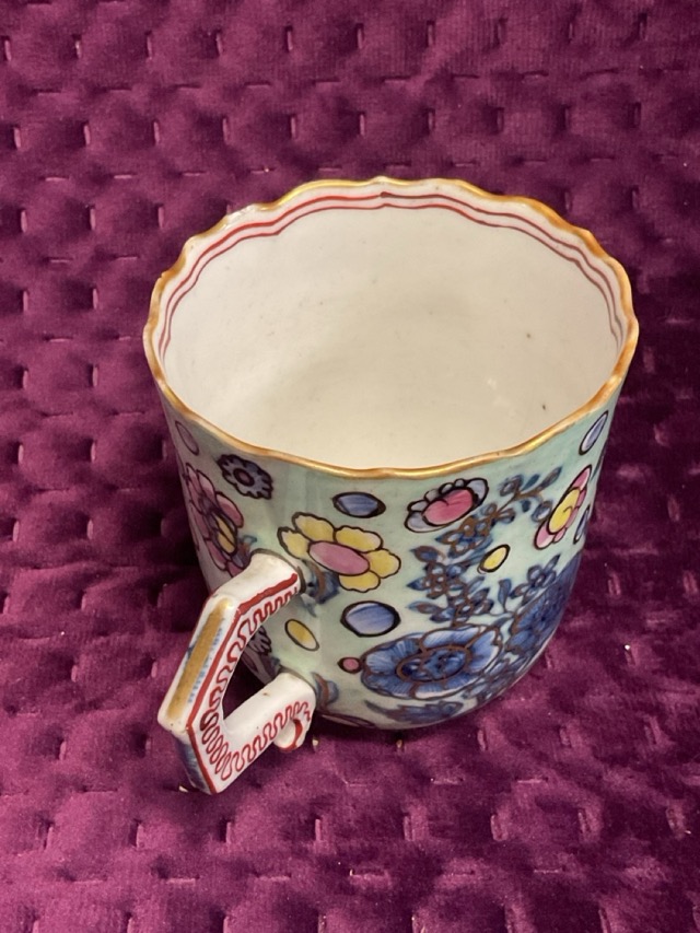 An C18th Chinese twin handled cup with scalloped rim and blue floral dedecoration, having clobbered overglaze gilt decoration. (2.75in)