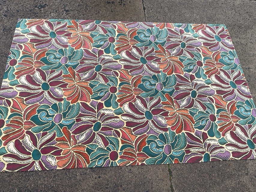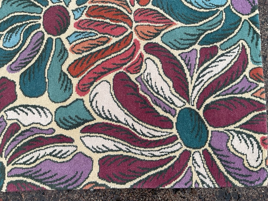 A contemporary multi-coloured O’Keefe style floral wool rug woven with large flowers on lemon ground. (120in x 79.75in)