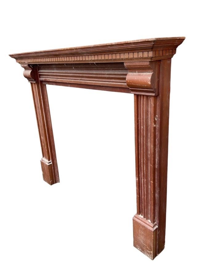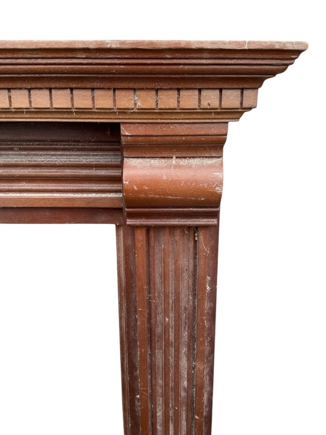 A Victorian style mahogany chimneypiece with dentil moulding beneath mantleshelf, having moulded frieze & jambs on plinths. (53in x 8in x 45in)