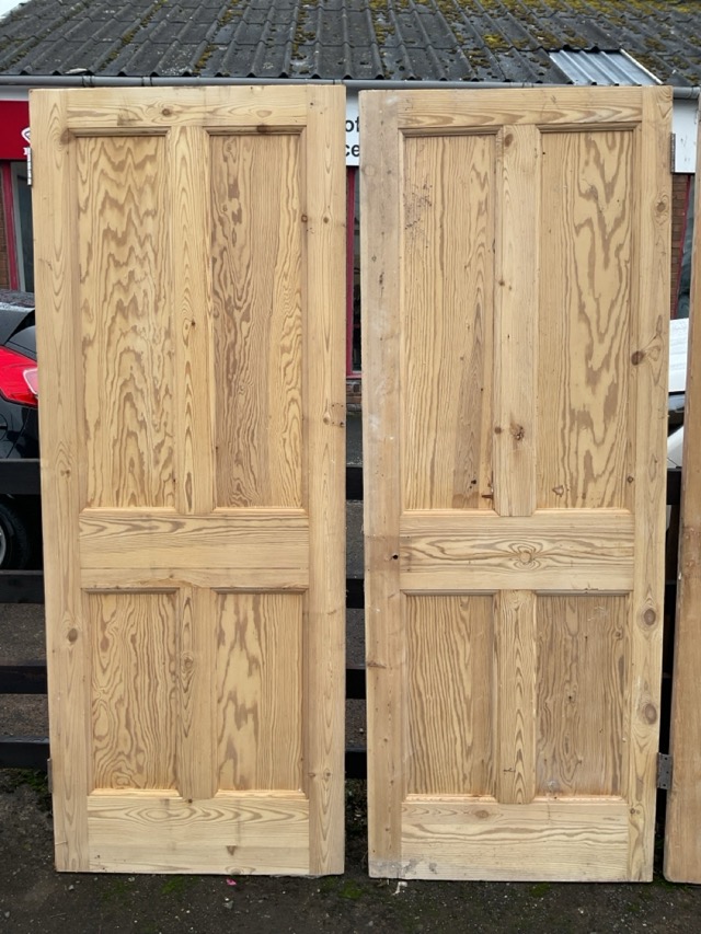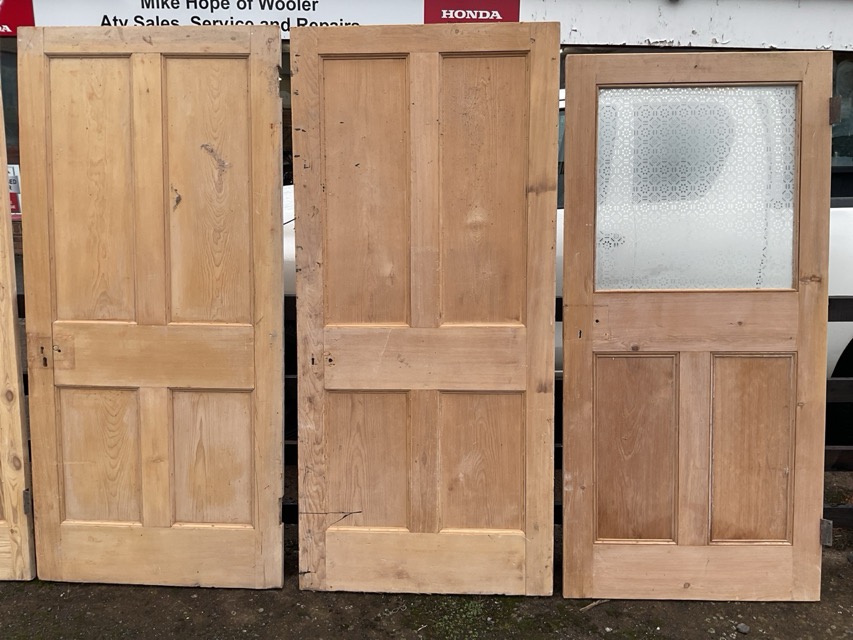 Five Victorian & later four-panel stripped pine doors, one glazed with acid etched glass, a pair - 35in x 78in, etc. (5)