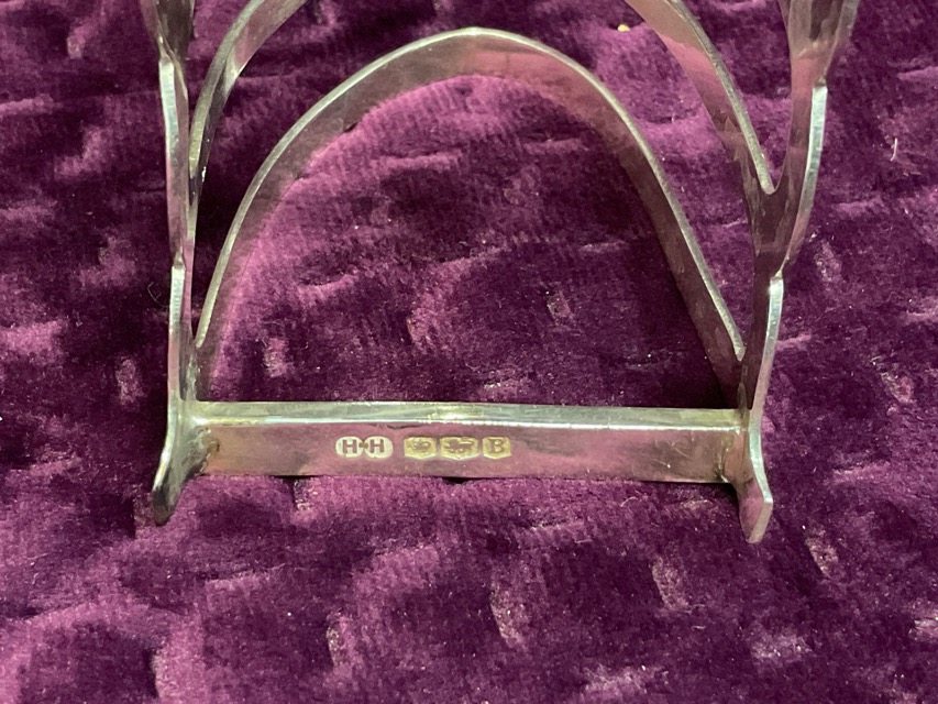 A pair of hallmarked silver toast racks, the arched dividers with lozenge shaped handles - Sheffield, 1944, H Hunt. (136.8g) (2)