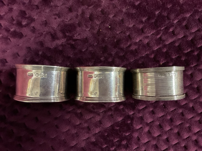 Four hallmarked silver napkin rings - a pair of Sheffield 1894 by Roberts & Belk, a single rectangular Birmingham 1925 by SW Smith, and a single Birmingham 1942 by John Vickery. (133.2g) (4)