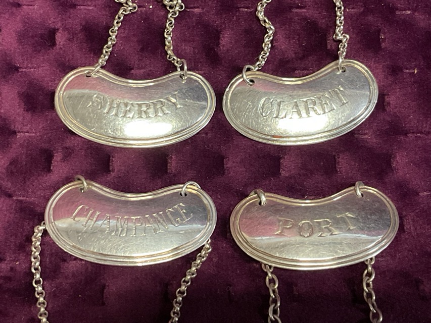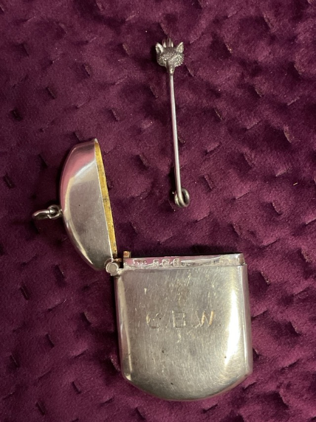 A set of four hallmarked silver kidney shaped decanter labels for port, claret, sherry and a misspelt champagne, Sheffield - 1894, Atkin Brothers; a silver vesta case - Birmingham - 1910, Rolason Brothers; and an Alfred James How silver brooch/pin with foxes head. (55.5g) (6)