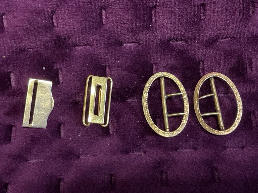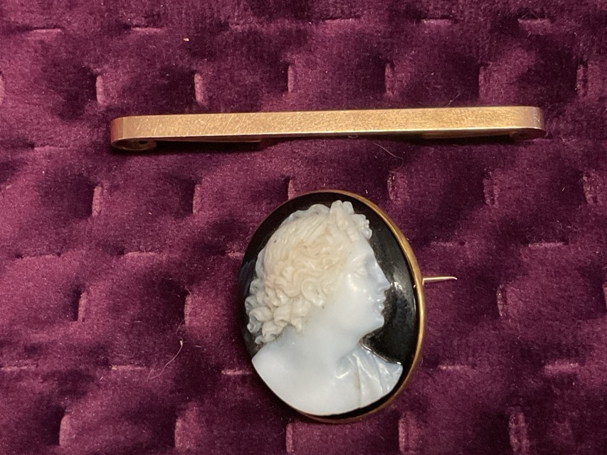 A plain 9ct gold bar brooch - 3.5g; and miscellaneous unmarked yellow metal pieces - a black & white agate cameo brooch, a pair of engraved oval buckles, etc. (5)