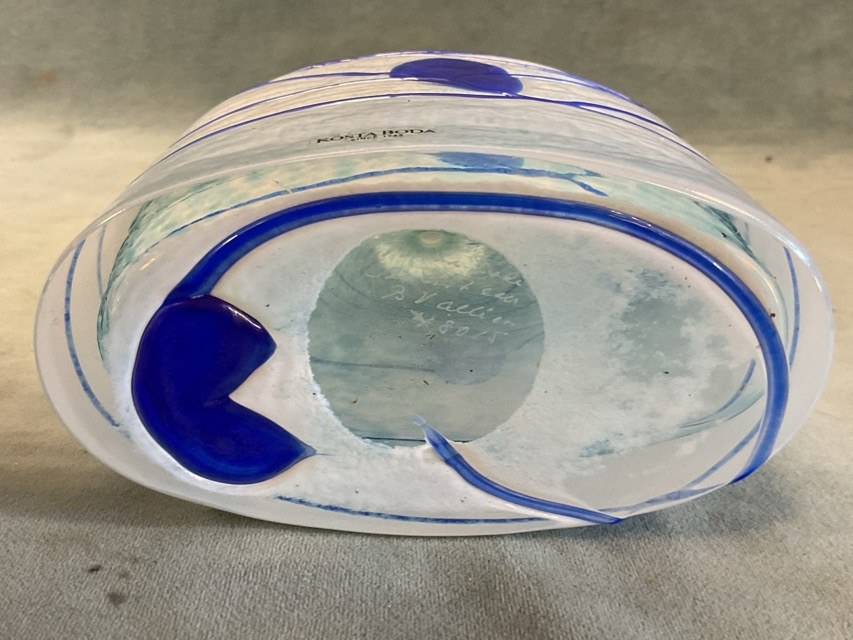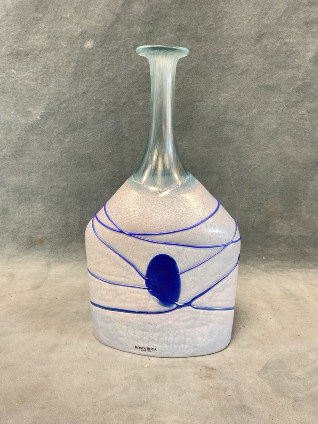 A Swedish overlaid art glass bottle vase by Kosta Boda, decorated with trailing blue glass on ice ground, beneath a slender lustre neck - signed Bertil Vallien. (9.75in)