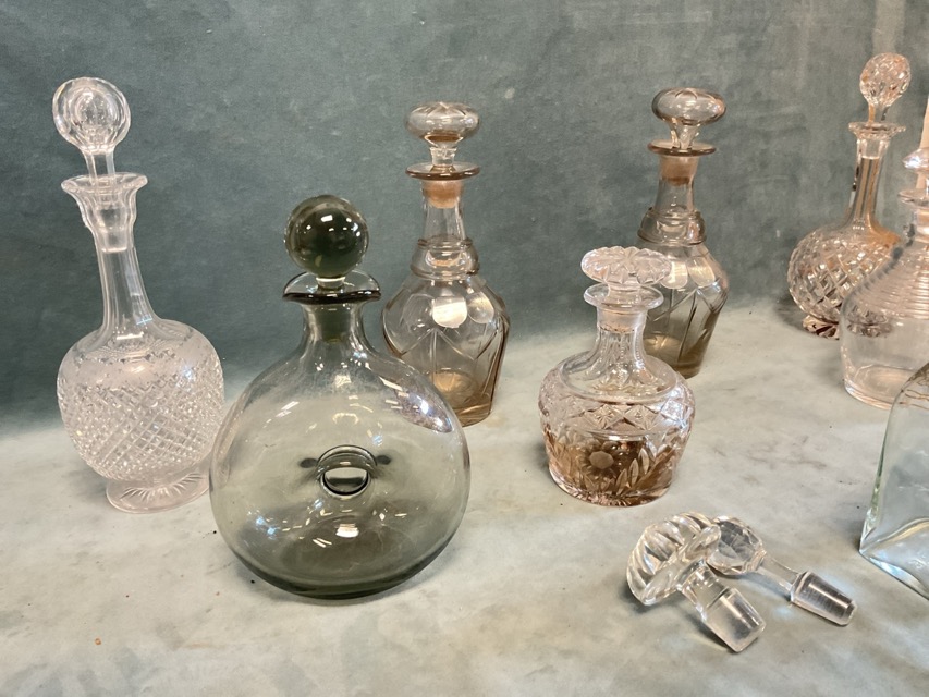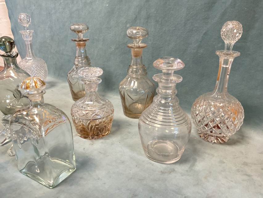 Miscellaneous decanters & stoppers - a pair with faceted shoulders & ring necks, ribbed Stuart, cut, gilded, vine engraved, smoked, two spare stoppers, etc. (10)