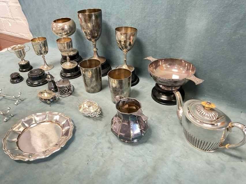 Miscellaneous silver plate - a ribbed bachelors teapot, a celtic quaiche, a chamfered jug, cruets, a pair of knife rests, a tea strainer, etc; and a collection of EPNS trophy cups on stands & two beakers. (A lot)