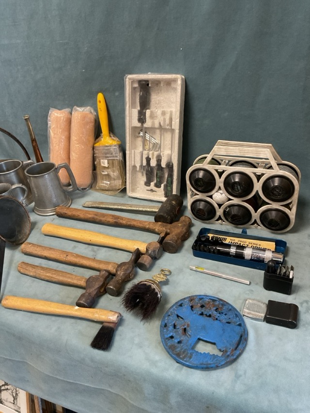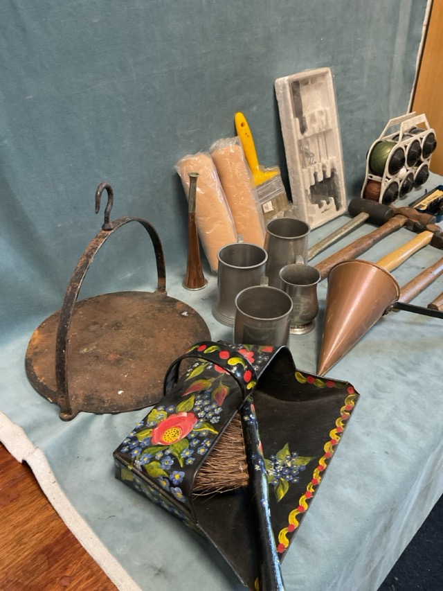 Miscellaneous items - pewter tankards, tools, a floral handpainted dustpan & brush, a cast iron skillet, a set of boules, a Butler hunting horn, a copper funnel, etc. (A lot)