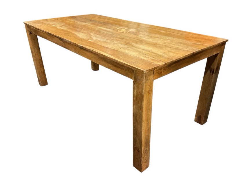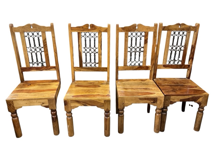 A 6ft hardwood table & four chairs, the rectangular table on solid square column legs, the chairs with wrought iron panels to backs and solid seats on turned pillar legs. (71in x 35.75in x 30in) (5)