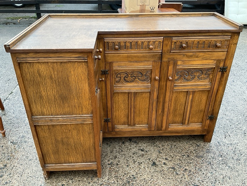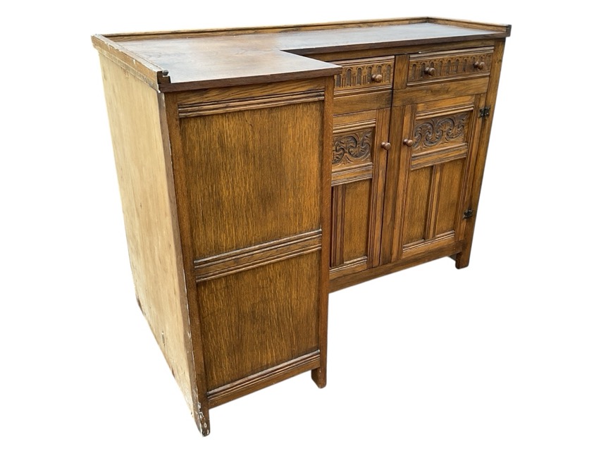 A carved oak corner unit with three cupboards modelled as drawers and doors, having fluted carved friezes and scrolled panels, raised on stiles. (53.5in x 17in x 38.5in)