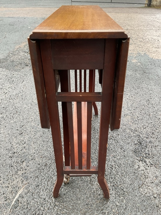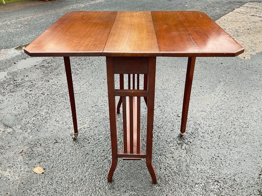 An Edwardian mahogany sutherland table with canted top having drop-leaves on gate legs with brass pot castors, the ends with square spindles above splayed legs. (9.5in x 26in x 27in closed)